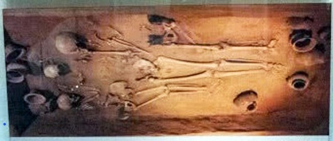 合葬一男二女,男性仰卧居中,左右各卧一女性,均呈侧卧屈肢,面向男性,表现出女子对男子的服侍顺从之意,郭沫若先生看后说:“这好像现出恋恋不舍的样子”。其反映出当时社会贵贱等级分明,男性占有统治地位。也有人认为这是奴隶制形成的初期阶段(图八)。