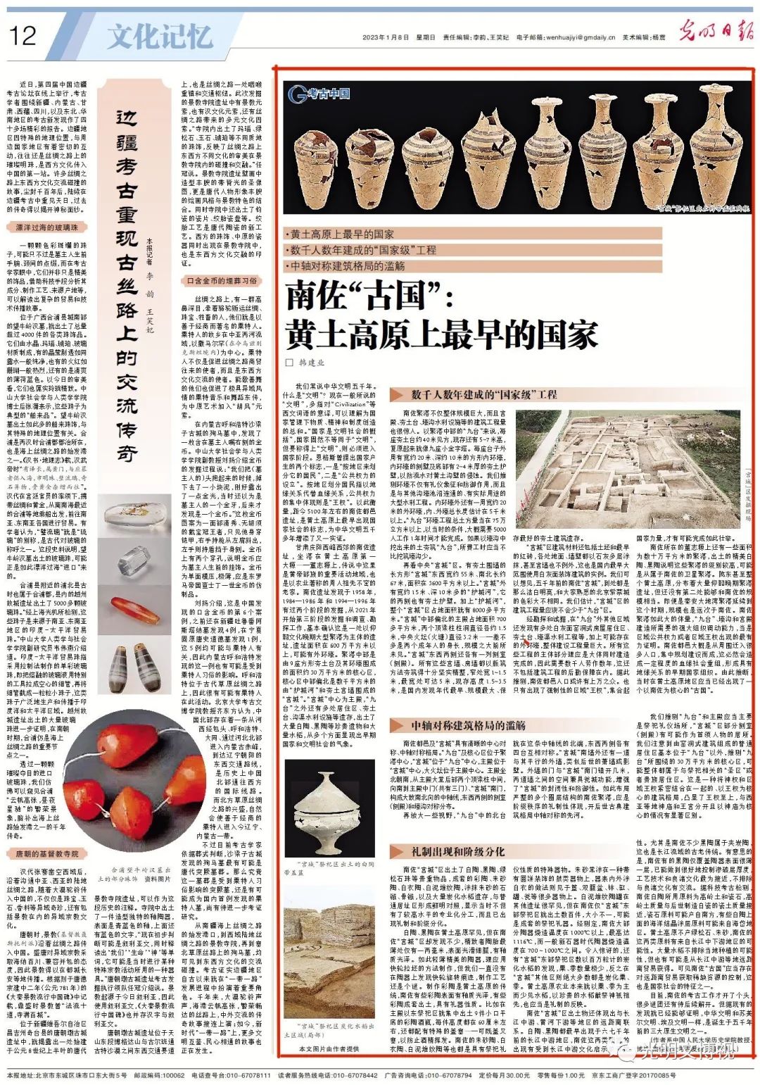 我们常说中华文明五千年。什么是“文明”?现在一般所说的“文明”,多指对“Civilization”等西文词语的意译,可以理解为国家管理下物质、精神和制度创造的总和。“国家是文明社会的概括”,国家固然不等同于“文明”,但要称得上“文明”,则必须进入国家阶段。恩格斯曾提出国家产生的两个标志,一是“按地区来划分它的国民”,二是“公共权力的设立”。按地区划分国民指以地缘关系代替血缘关系,公共权力的集中体现则是“王权”。以此衡量,距今5100年左右的南佐都邑遗址,是黄土高原上最早出现国家社会的标志,为中华文明五千多年增添了又一实证。
