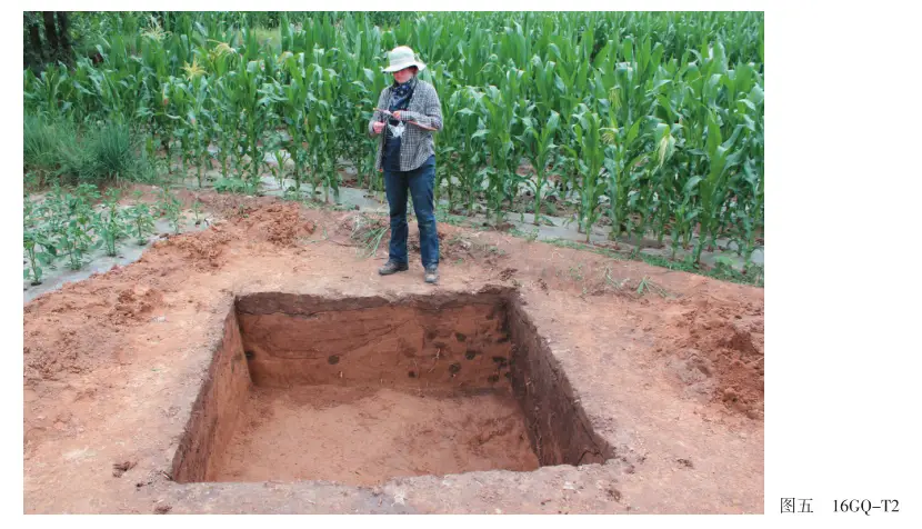 2016 年 7 月,甘肃省文物考古研究所与北京大学考古文博学院、美国哈佛大学人类学系组成联合考古队,对齐家坪遗址进行了首次试掘。遗址南、北部各一处试掘点,试掘面积 17 平方米,面积虽小却收获颇丰。南部布设 5 米 ×2 米探方,根据需要向西、向南扩方,试掘面积 13 平方米。发现窑址 1 座、灰坑 2 个,灰坑属于齐家文化,窑址尚未清理完成,时代不明。Y1 呈东西向,顶部被破坏,仅对窑室北侧局部进行清理,深约0.7 米,堆积 3 层,但尚未清理至底部。北部布设 2 米 ×2 米探方,试掘面积 4 平方米(图五)。