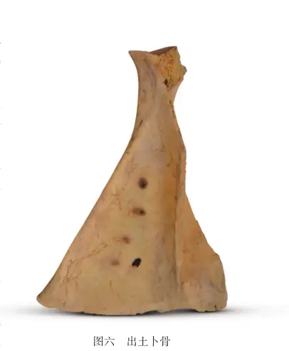 确认灰坑 2 个,编号 H1 和 H2,H1 打破 H2。H1 为现代垃圾坑。H2 近圆形,直径约 1.8、深约 1.2 米,出土大量齐家文化陶片、石块及兽骨等,其下部堆积清理出有明显烧灼痕迹的卜骨 2 件,均为羊肩胛骨(图六)。