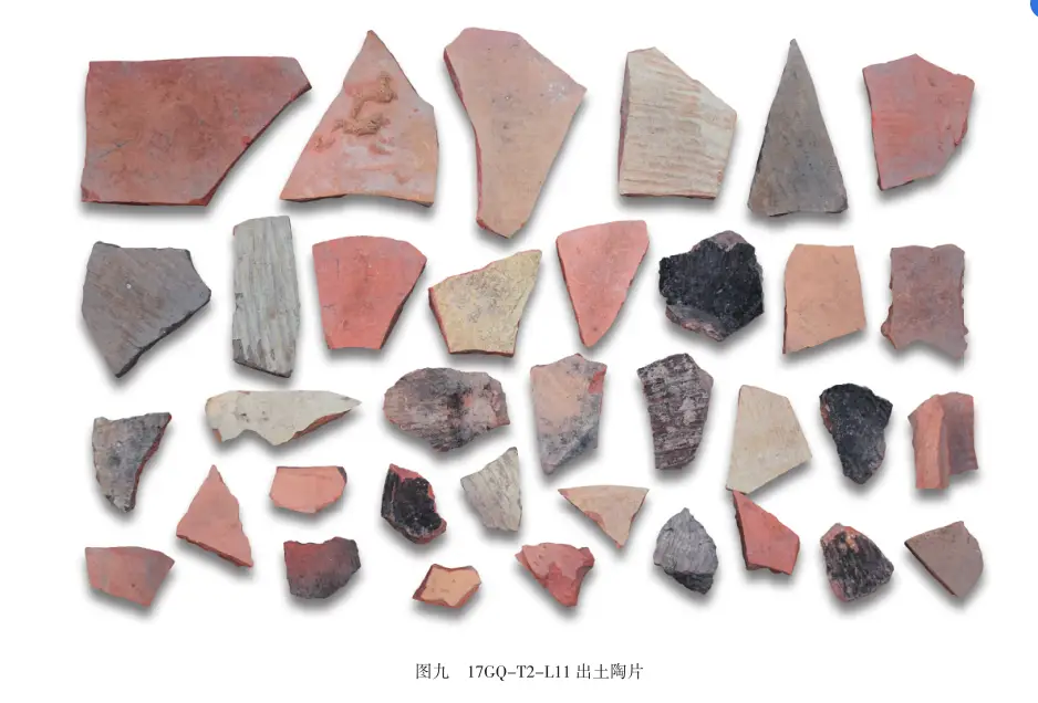操作间平面呈圆形,窑室平面呈圆角长方形,窑室底面平整,三条火道留有使用后的红烧土痕迹,三条火道尾端与窑室后壁上的左右中对称分布的三条烟道相连,并经窑室后壁上部相连形成一个完整烟道。从窑室及烟道出土瓷片等遗物判断,应属于宋代窑址。北部试掘点选择在 2016 年发掘位置北侧约 20 米处布设 2米 ×2 米探方(图八),清理齐家文化灰坑 2 个,同样出土了大量陶片、石块及兽骨等遗物(图九)。
