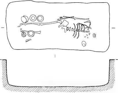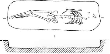 仰身屈肢葬。人骨保存较完整,头骨仅存下颌骨。发掘者鉴定墓主为 35 ~ 40 岁的女性。