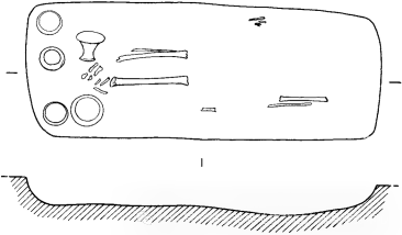 以图四M10号为例,该墓资料仅有简单的记录和平、剖面图,无遗迹照。该墓开口于上层,墓口距地表深 0.55 米,墓底距地表深 0.85 米。位于 A 区中部偏南, AT2 西北角,东邻 M28,西邻 M32。长方形竖穴土坑墓。墓向 0°。墓圹长 1.54、宽 0.54、深 0.3 米。无葬具,填土未记录。